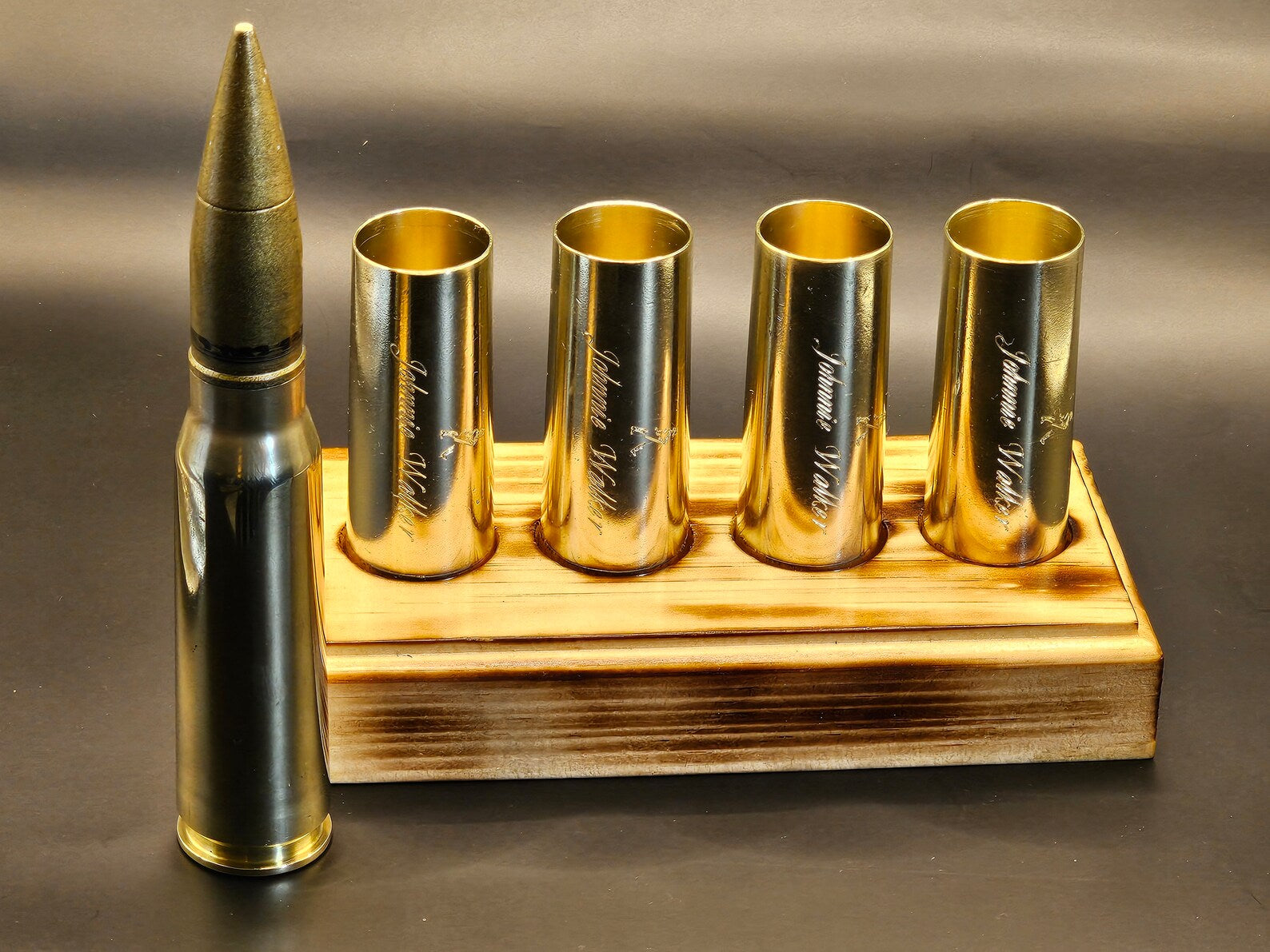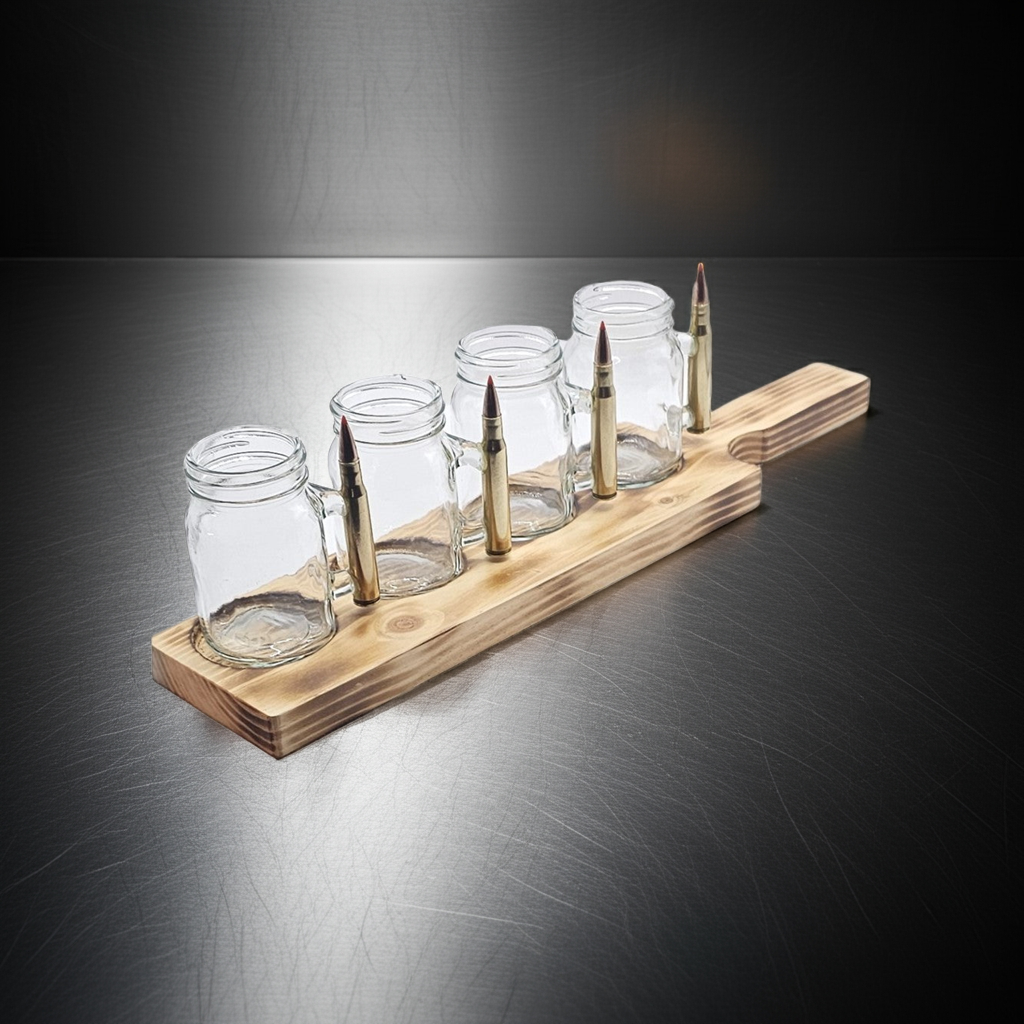 shot glasses or flight glasses with 30-06 Winchester bullet handle in a nice serving board with a carry handle
