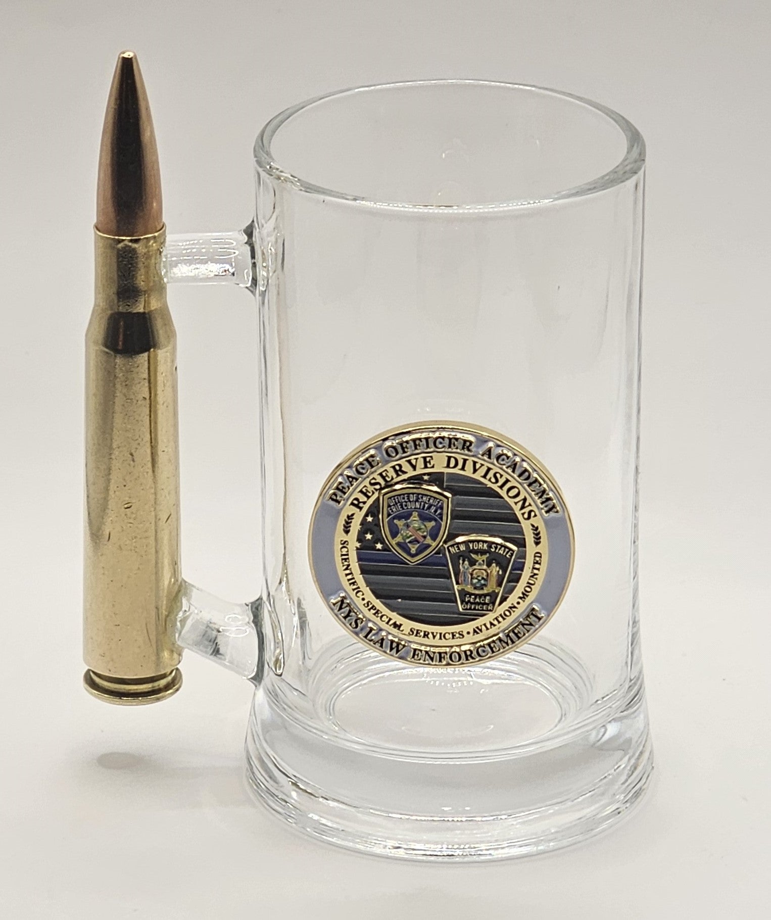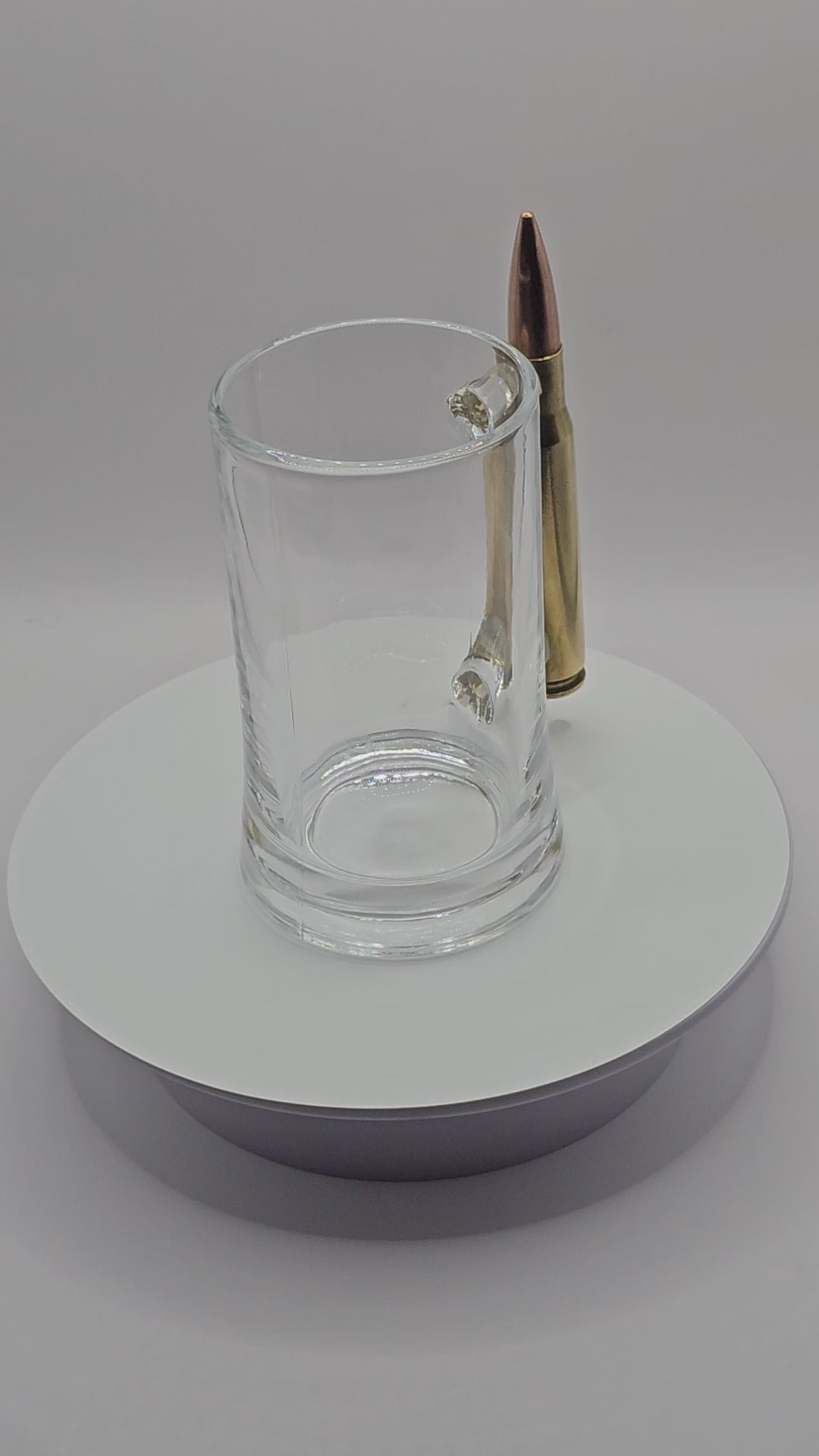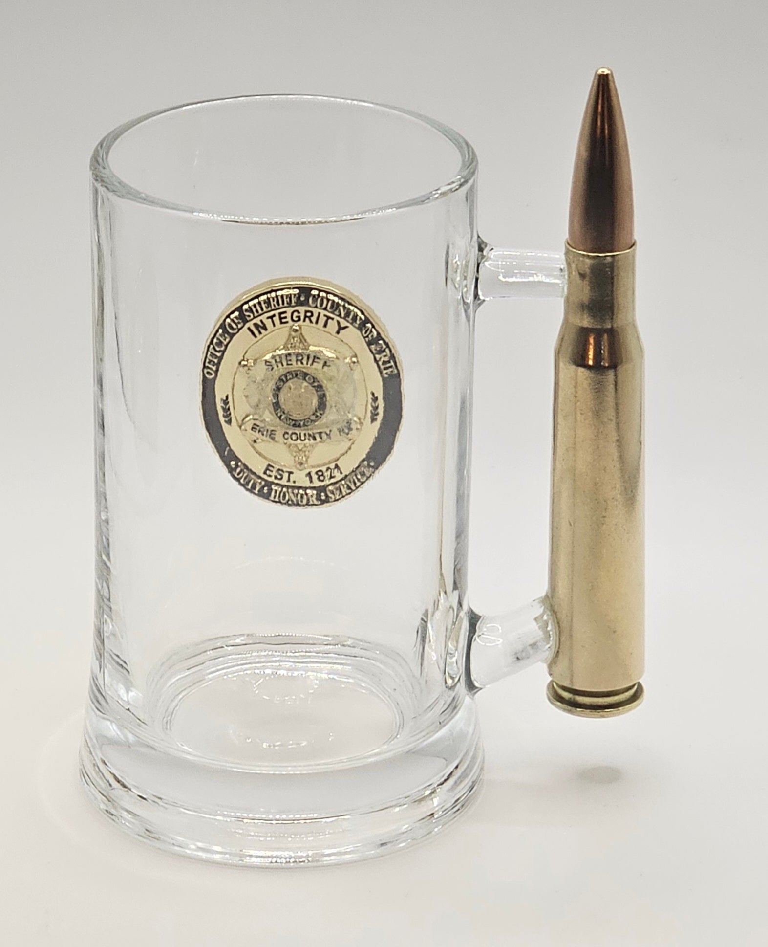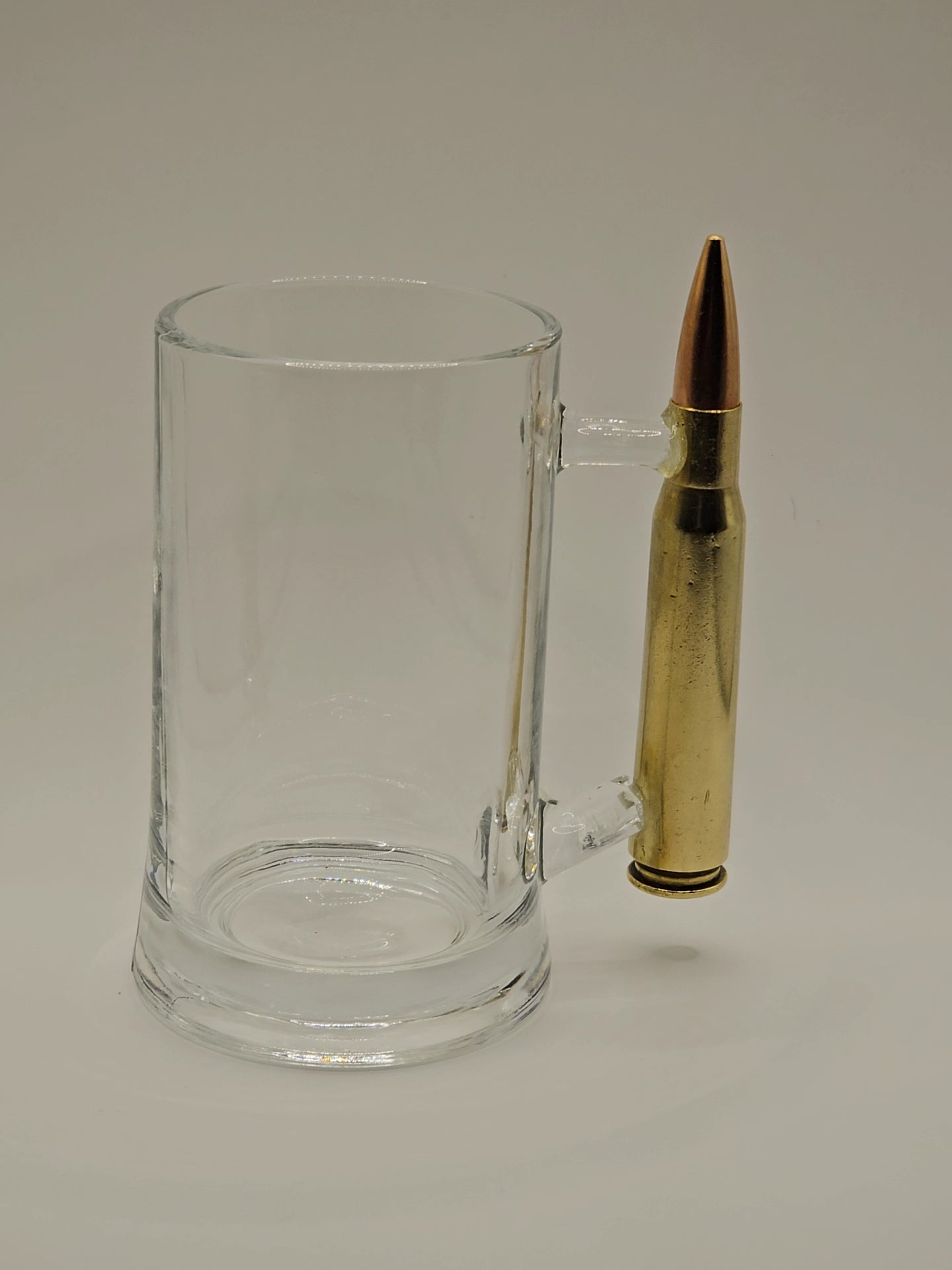 Glass Mug with 50 cal. BMG bullet handle.... Free engraving on the bullet handle