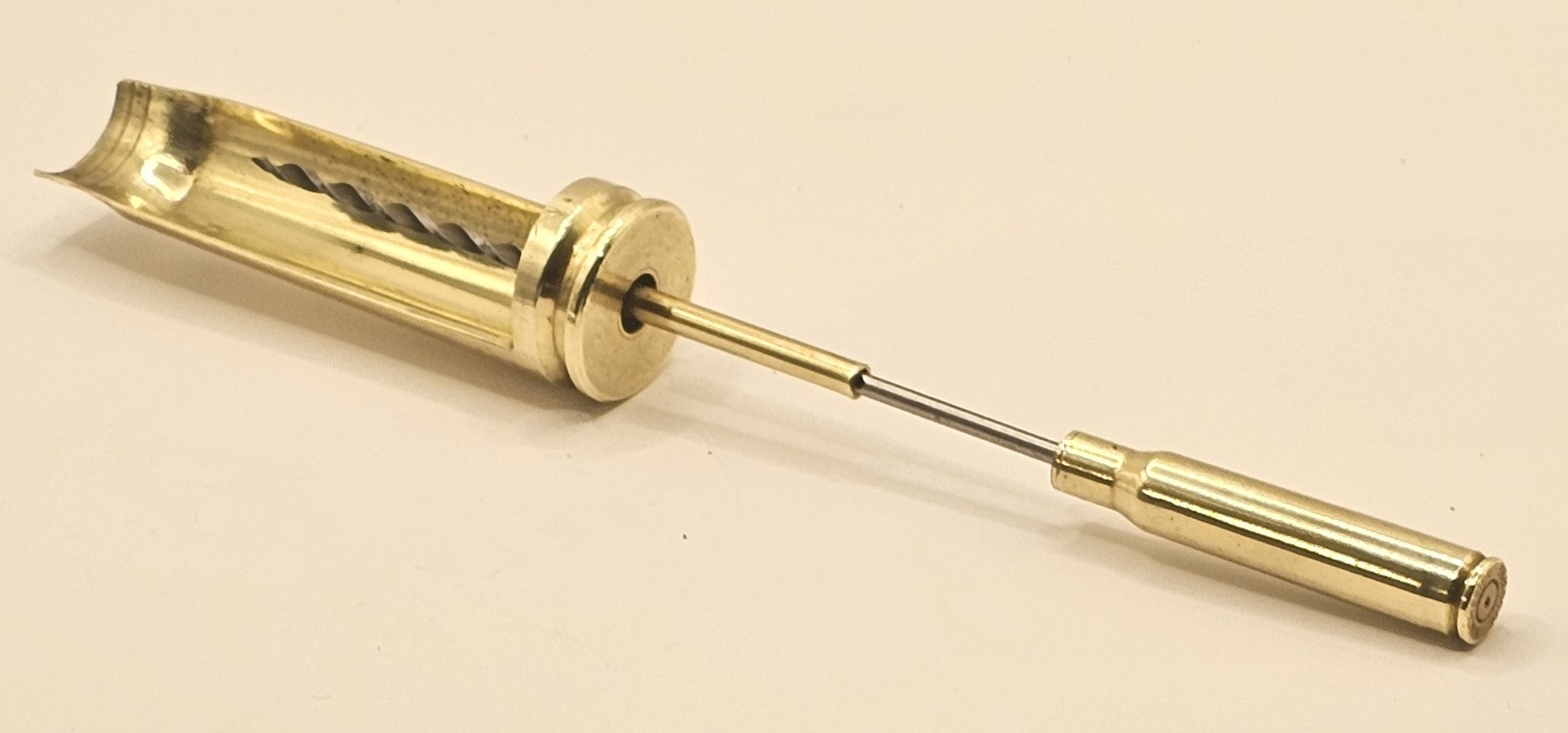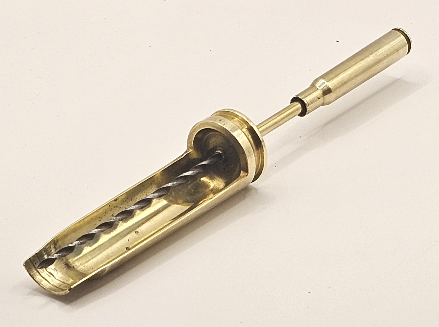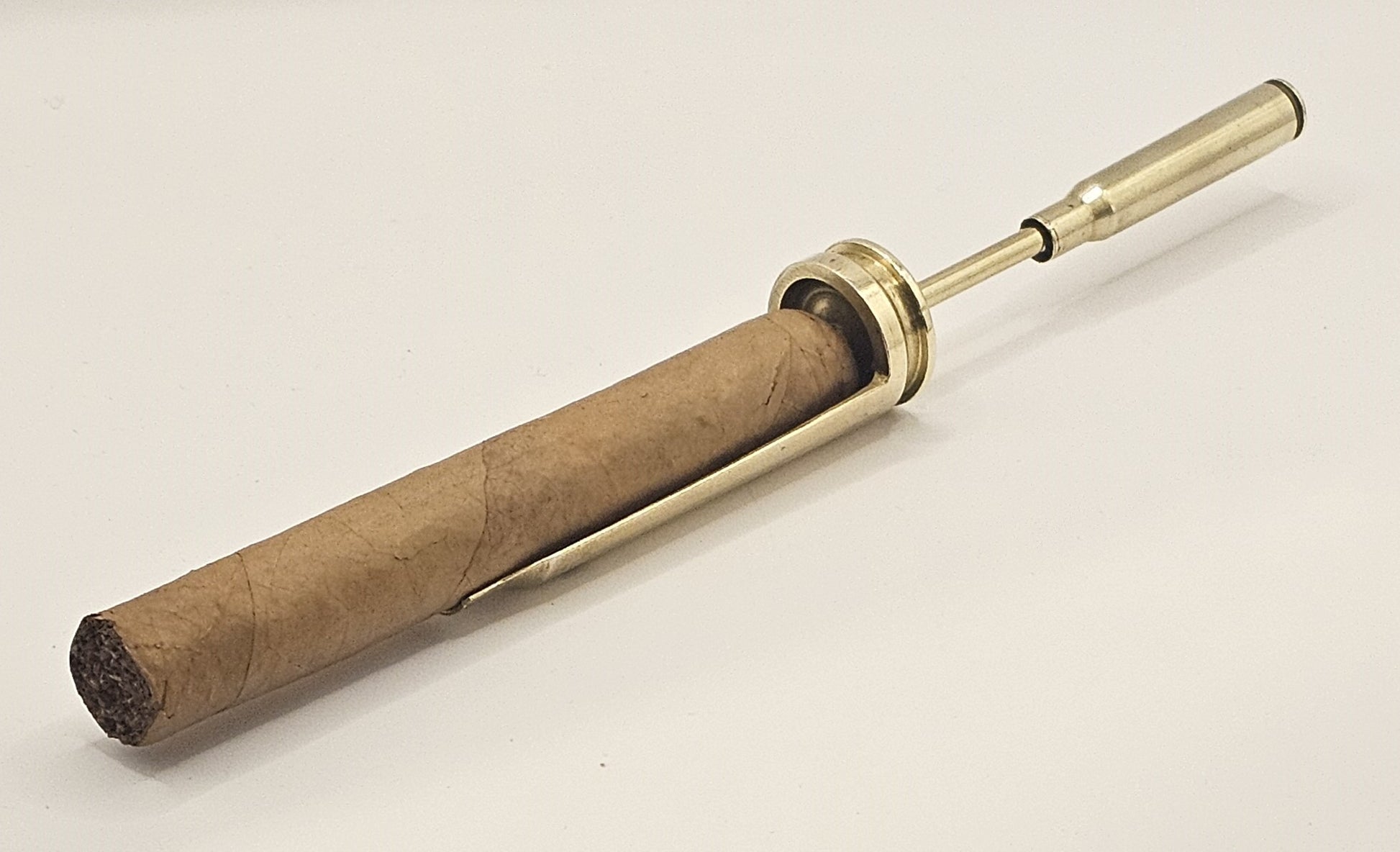 Draw enhancer tool made from a 20mm Vulcan Canon Brass case and a 30-06 Springfield brass case.... This one-of-a-kind tool not only drills out the cigar for an easier draw but also keeps the cigar centered so the drill runs straight all the way in....plus the 20mm Vulcan brass tray helps prevent crushing and breaking the cigar when holding and drilling the hole....
