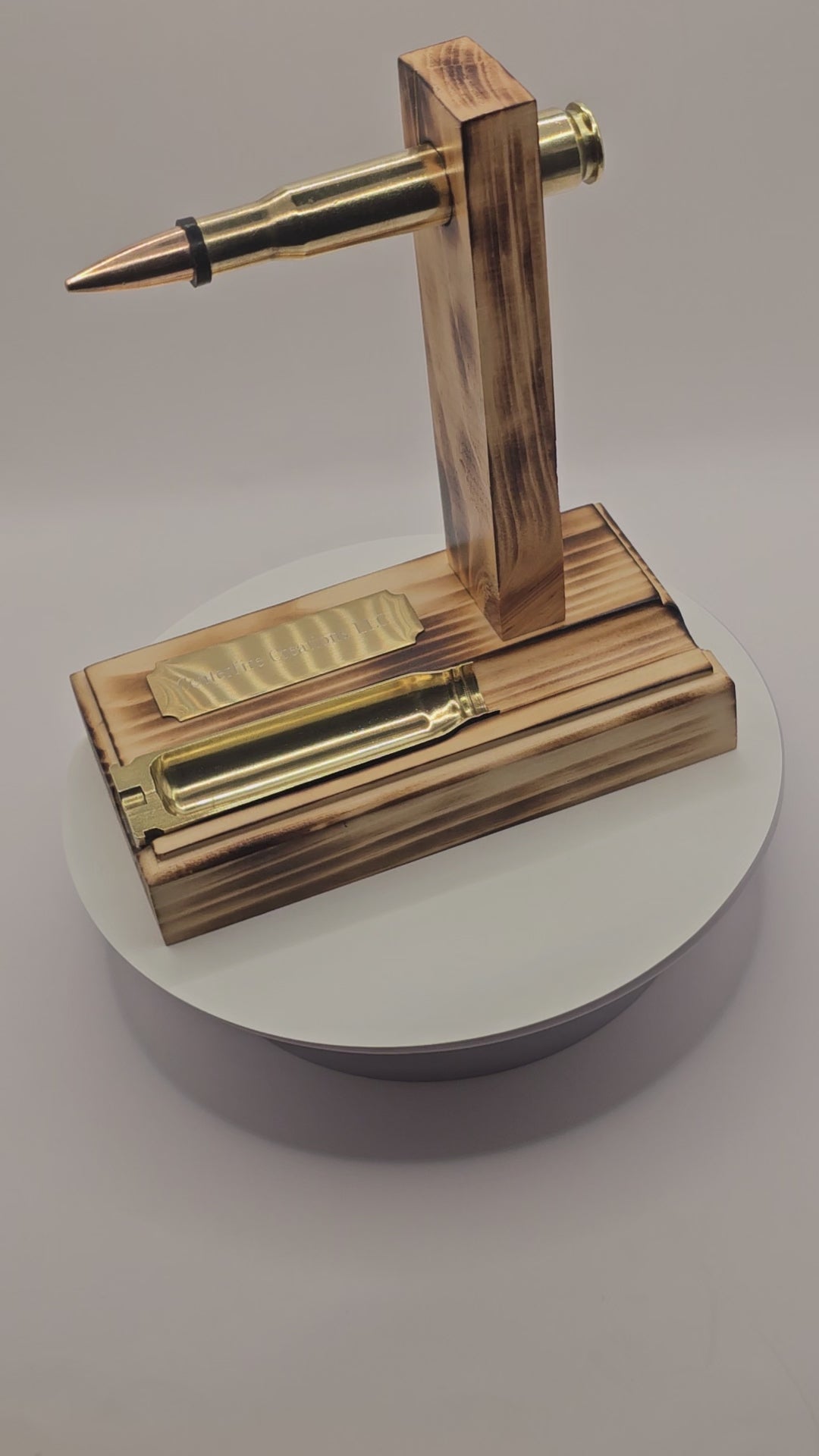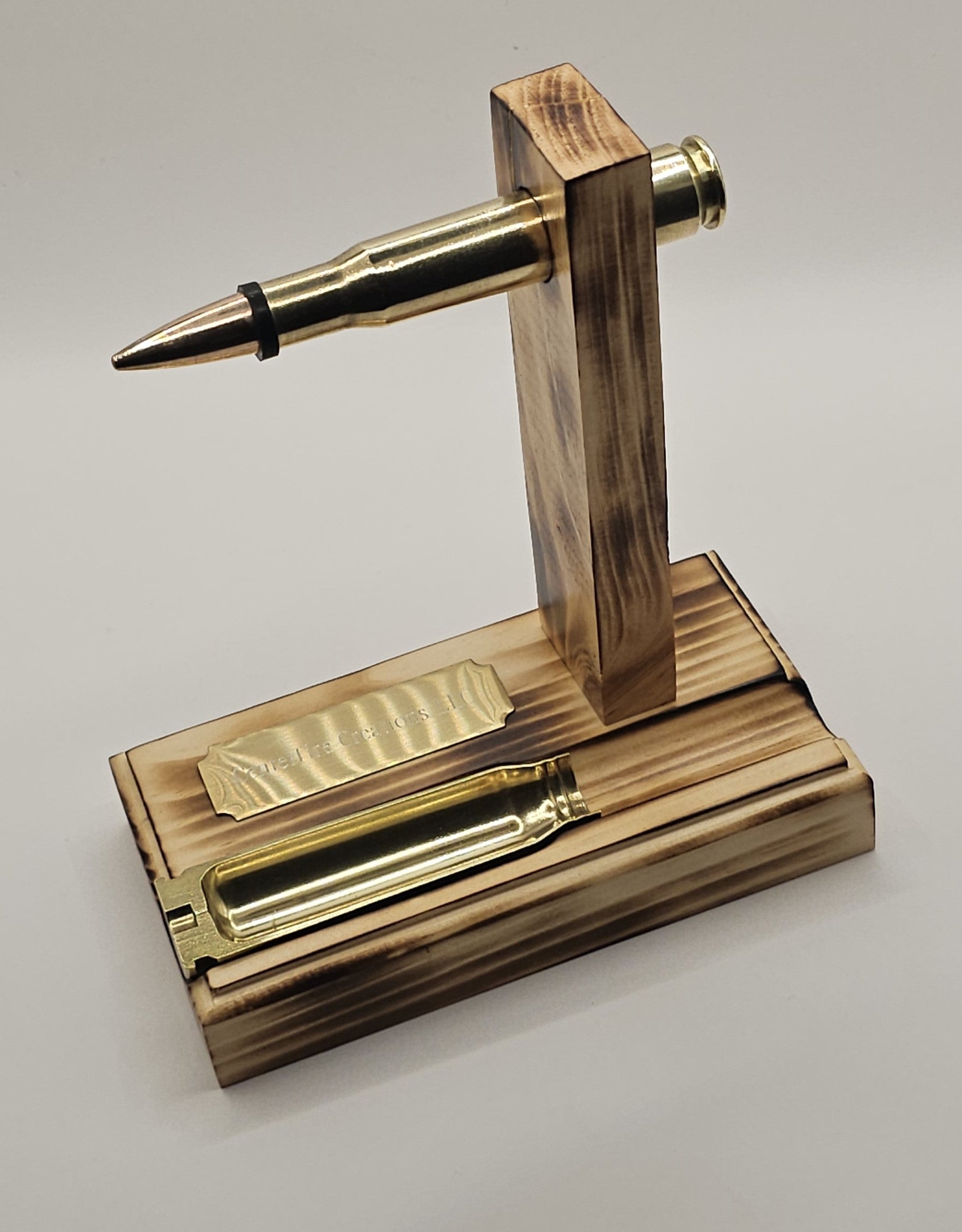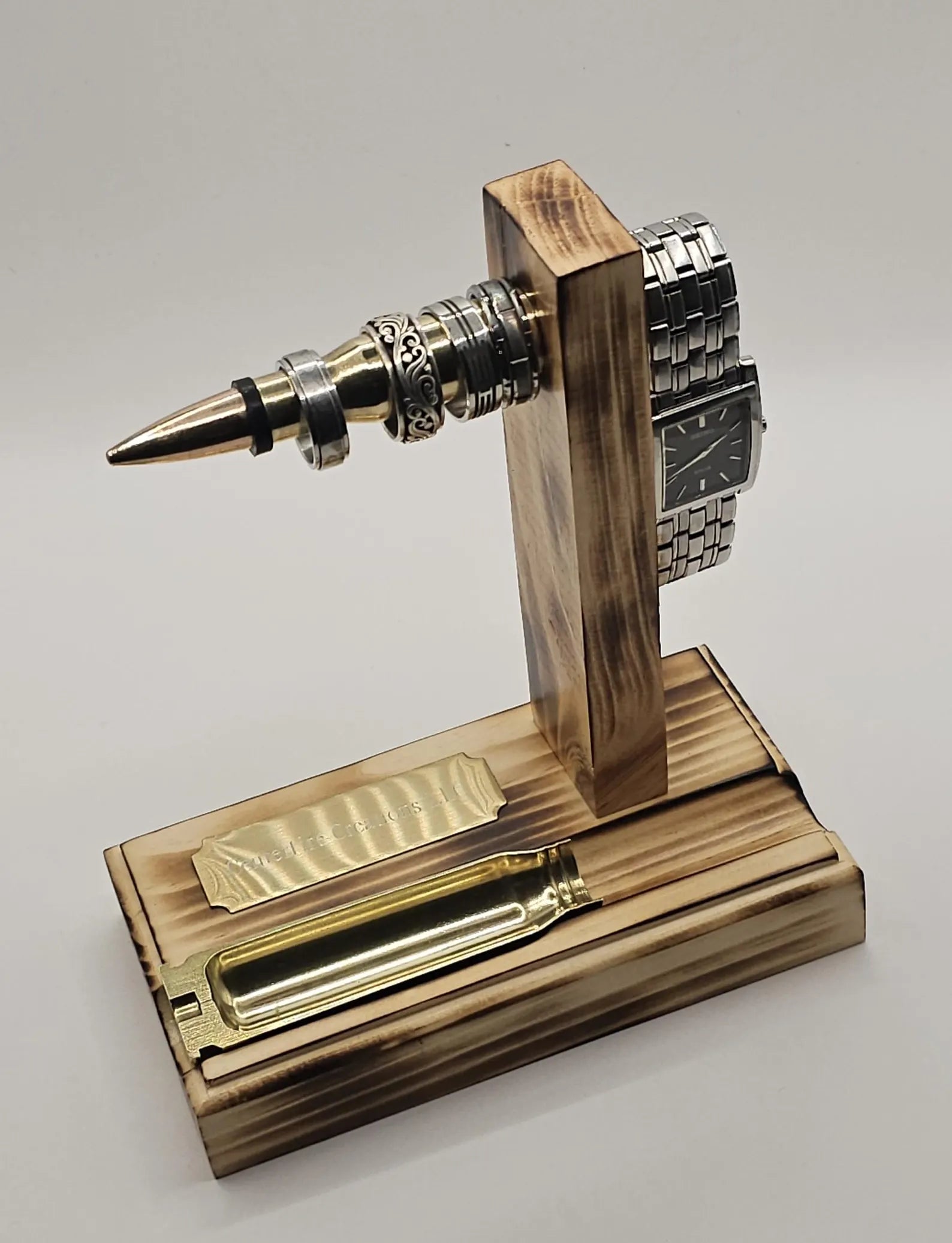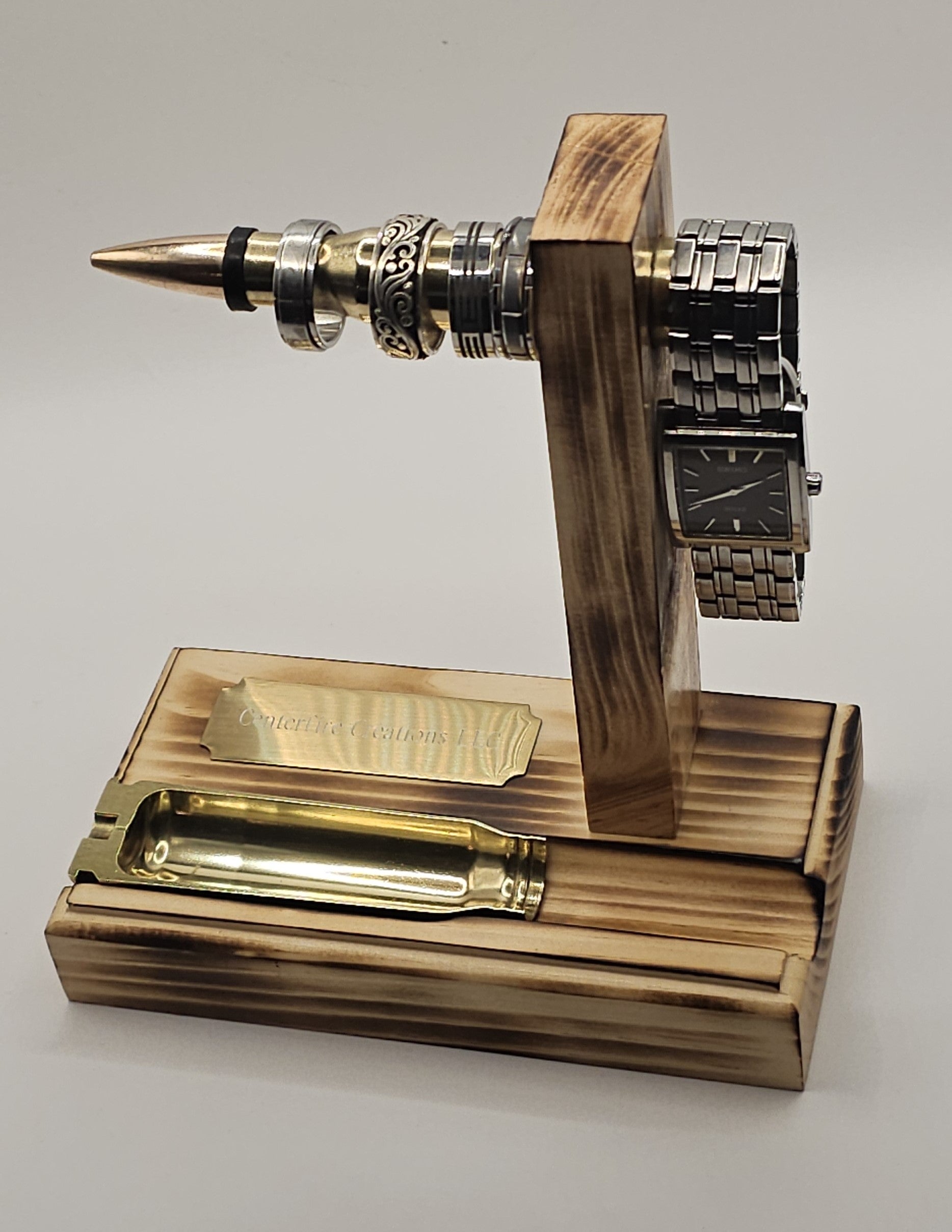 50 cal BMG Bullet Ring and Watch Holder Stand....This stand has a 50 cal BMG Bullet mounted in a block of wood and attached to a wooden base..... Also, a 20 mm Vulcan Bullet brass case cut in half set inside the wood base that can be used for rings or chain necklaces or anything small as a catch all tray.... The bullet is used to hang rings, watch, bracelets, or anything that does not hang too long... Can attach a nice plaque for engraving