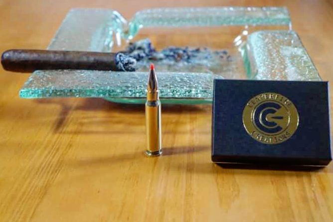 The "Sharpshooter" is a one-of-a-kind, Automatic Self-cleaning Bullet cigar punch, handcrafted from authentic centerfire cartridges. This Patented bullet cigar punch will amaze anyone when they see what looks like a real loaded bullet cut a perfect hole in their cigar.