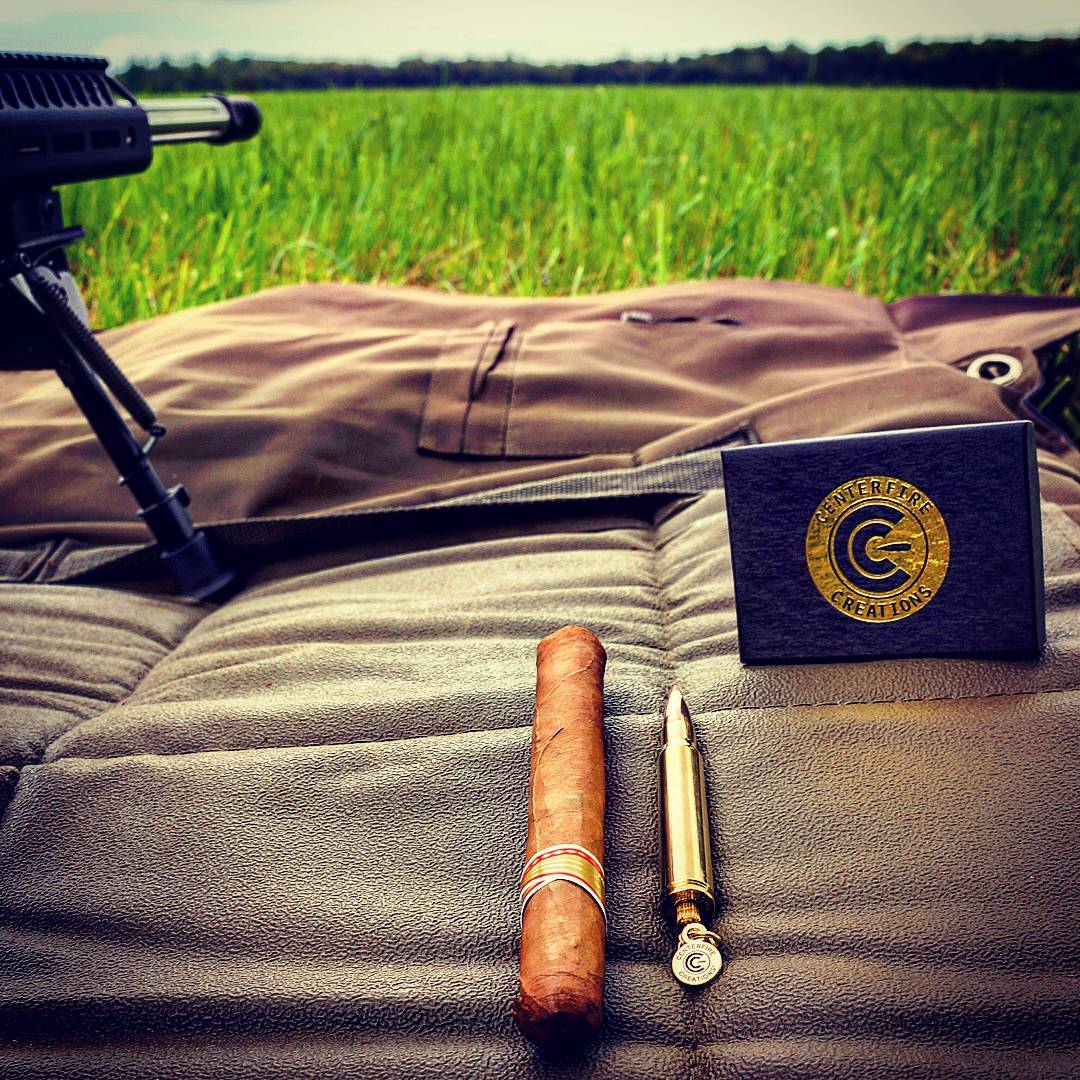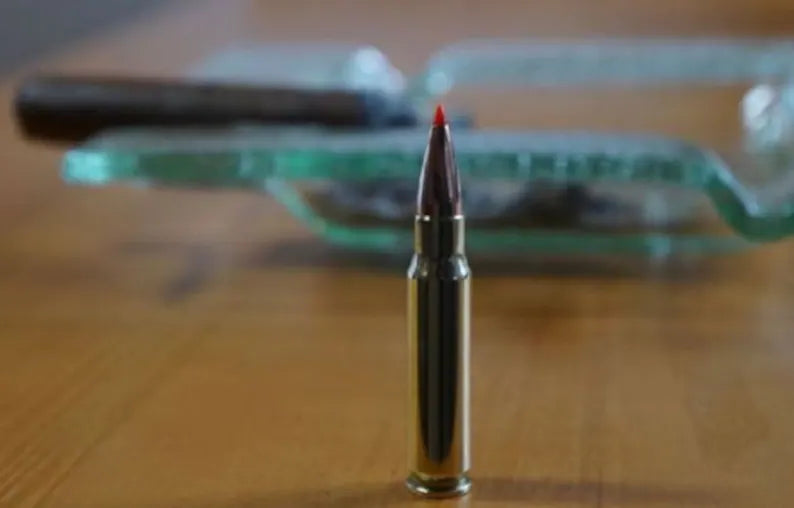 The "Sharpshooter" is a one-of-a-kind, Automatic self-cleaning Bullet cigar punch, handcrafted from authentic centerfire cartridges. This Patented bullet cigar punch will amaze anyone when they see what looks like a real loaded bullet cut a perfect hole in their cigar.