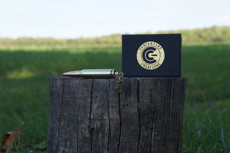 The punch comes with a key ring/chain attachment that you can remove for that real bullet look. Also comes with our Logo tag and anti-tarnish velveteen bag.